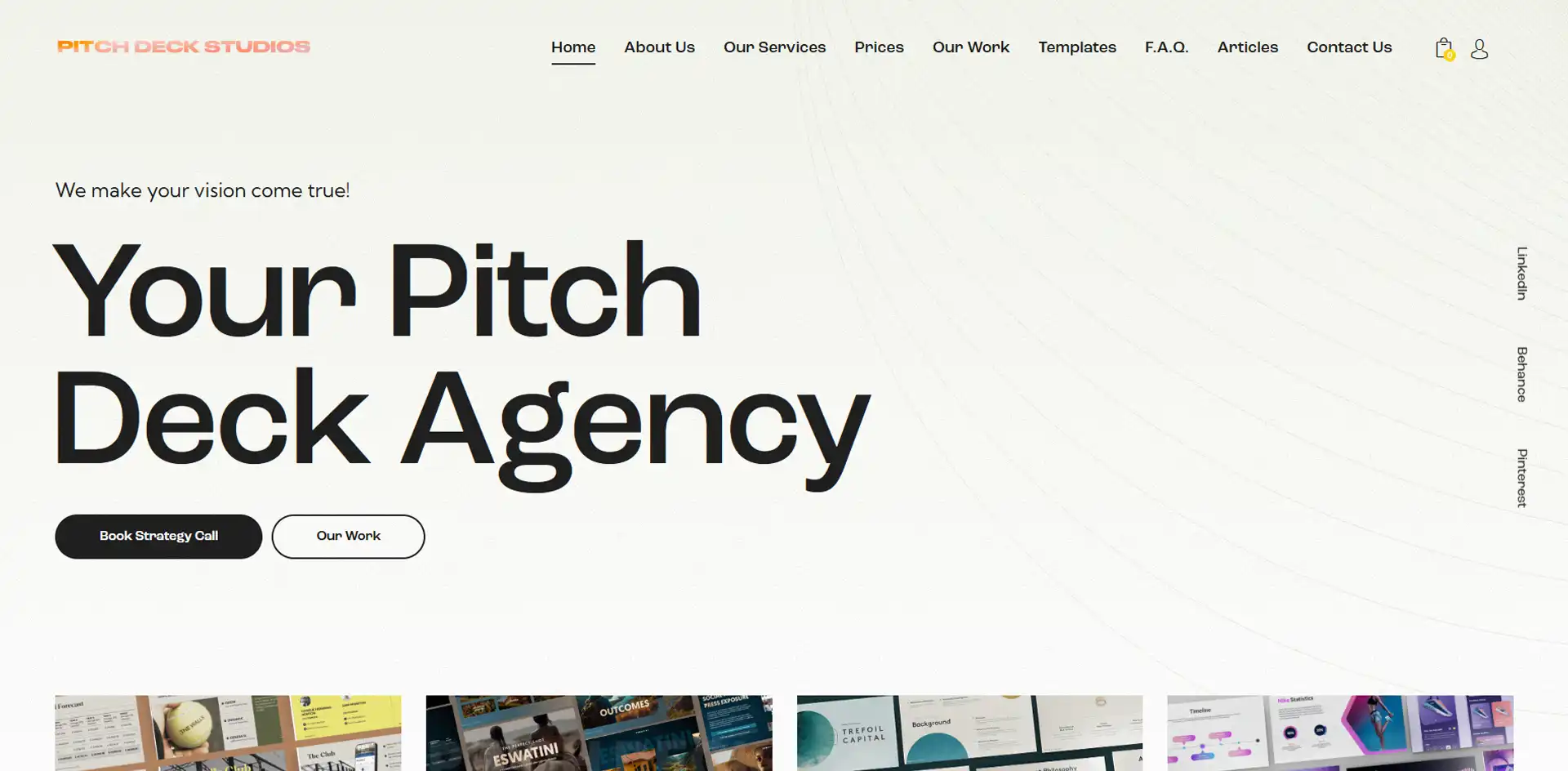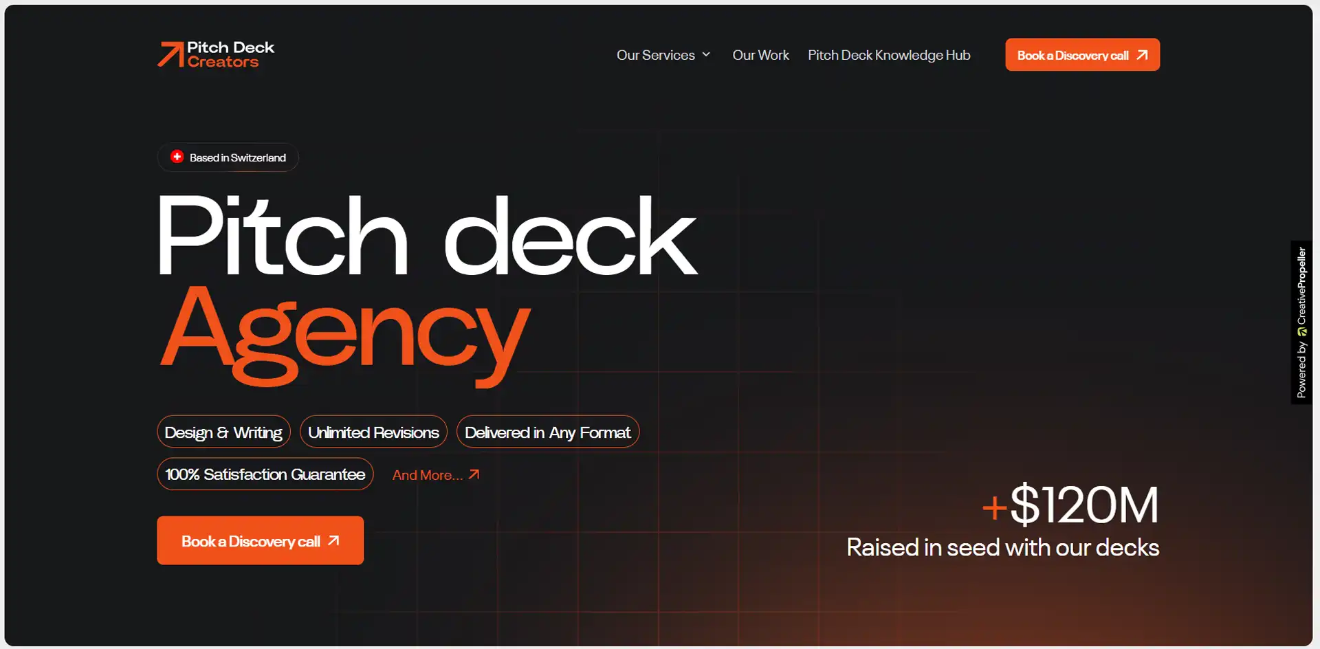 | Pitch Deck Creators | Pitch Deck Creators is an elite agency crafting unique, high-quality pitch decks tailored to impress investors. The expert team is dedicated to transforming complex ideas into an investor-ready story. | Pitch Decks, Visual Storytelling, Financial Modeling, Business Plans. |