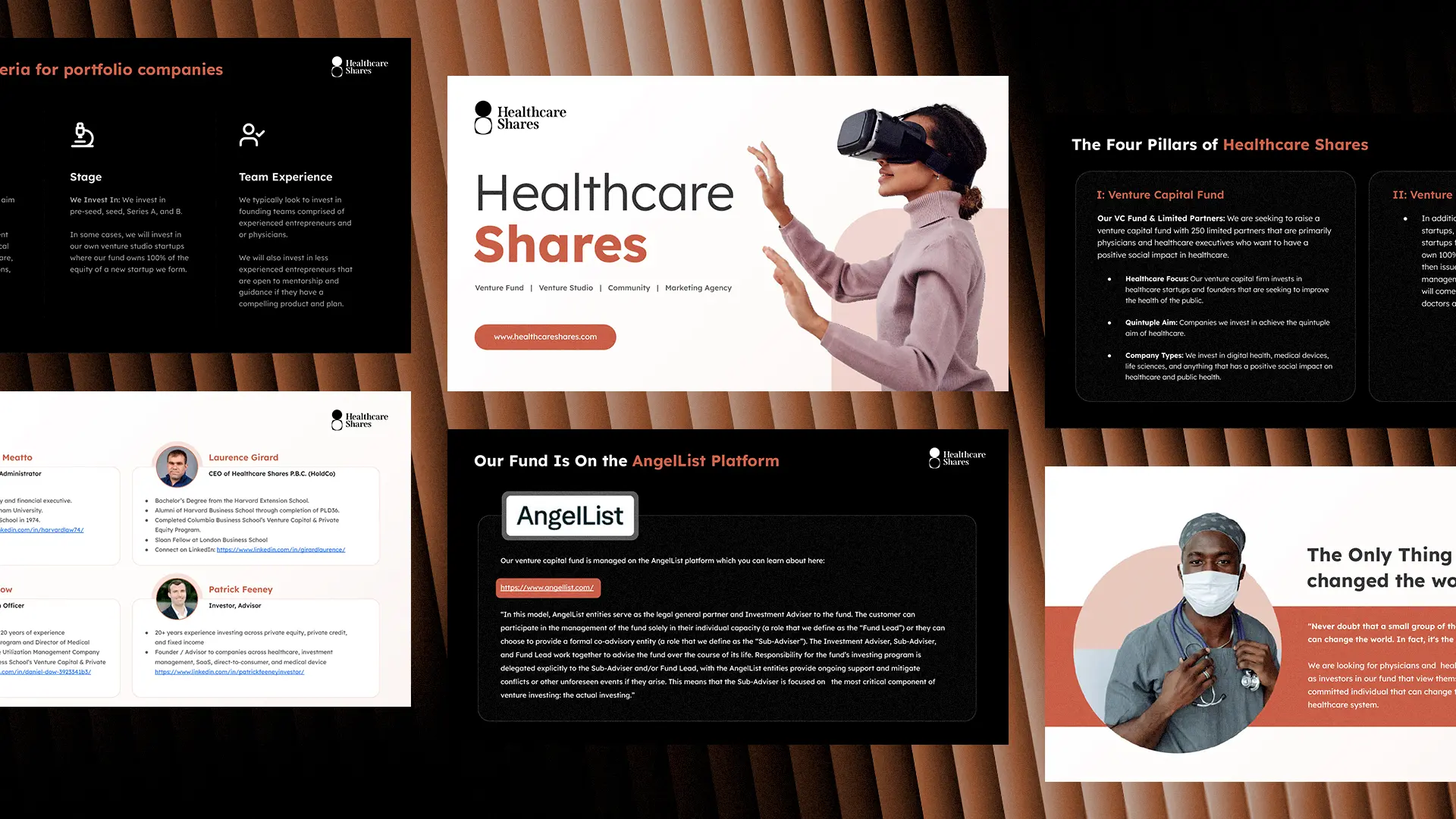 Healthcare Shares operates at the intersection of venture funding, studio building, and healthcare innovation. While the model was strong, the challenge was communicating multiple offerings — fund, studio, community, and agency — within a single, cohesive narrative.
